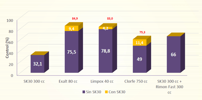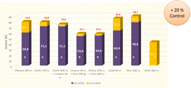 Efecto de SK30 Para el control de Spodoptera f en Cultivos de Maíz a los 7 DDA